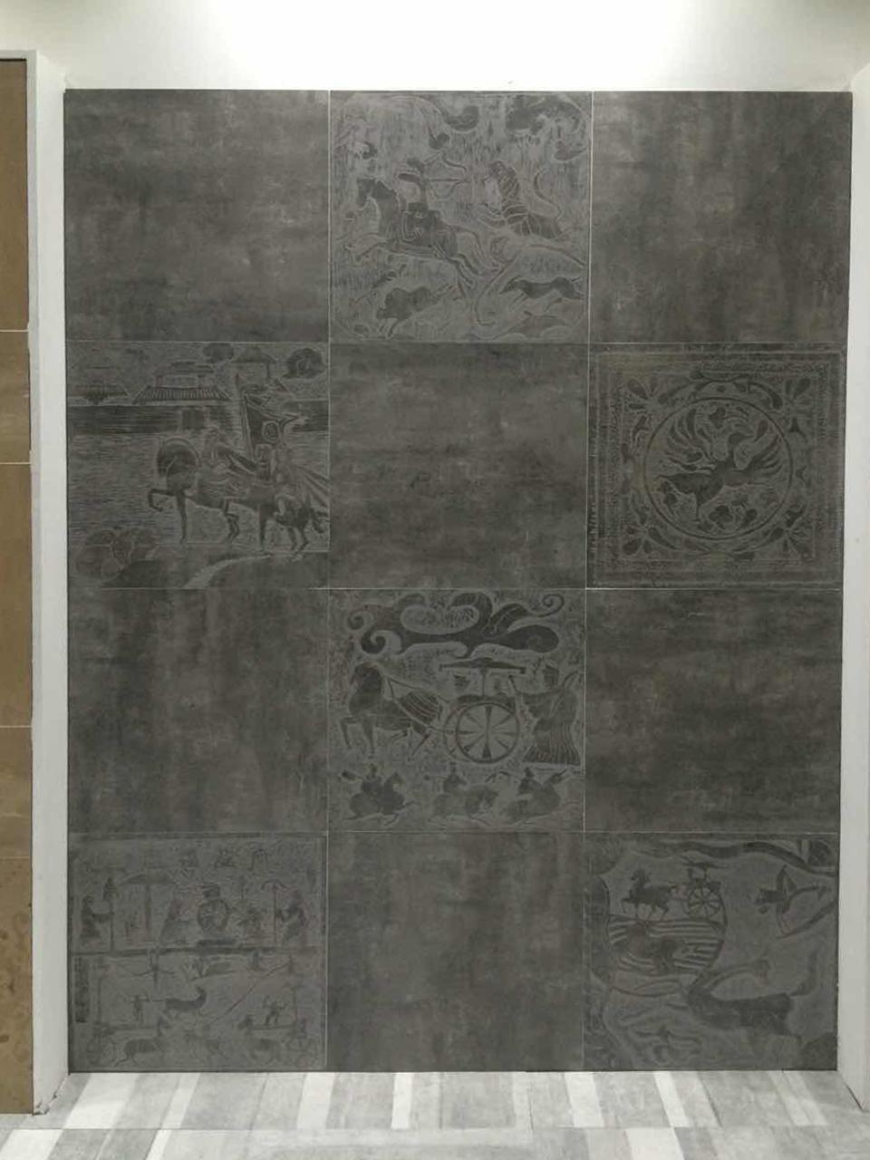 展位有這樣一面展示,遠遠看像一幅3D逼真的秦代畫像圖,走進一看才知道這是平面水泥磚。經照舊工作人員介紹,這個系列叫做“秦磚漢瓦”,是一款具有凹陷效果的水泥磚、通過提取古代畫像磚圖案,不同層次的色塊,特殊工藝,營造了一幅幅別具一格動態皆宜的秦代民俗畫。這一組系列專門打造具有秦漢故事的水泥磚,顯示出中國源遠流長的文化。這個系列包含主磚九個設計和配件八個設計。另外據介紹,此款系列早已獲得第四屆“中意陶瓷大賽優秀獎”殊榮。
