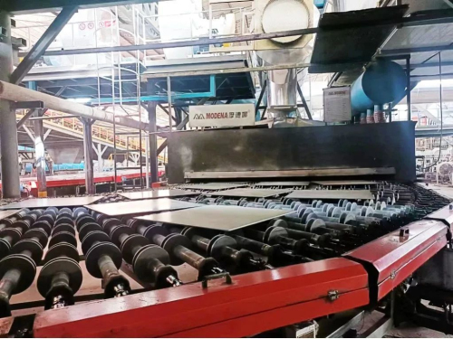 本次合作選用的是兩條摩德娜MRD-HB6系列多層自循環干燥窯(L=115.5M)及MDS系列節能高效寬體窯(L=556.5M)米,線速度35米/分鐘,主要產品規格為400x800mm,最低日產量十萬平方米!在保證質量和兼顧大產量的雙重要求下,整個項目從設計、材料、制造、安裝以及調試無疑是行業裝備的又一次極限升級!該項目配置先進的數智化生產線及窯爐燃燒系統和智能溫控管理軟件,科學分析坯體表面強度和氧化速度設計合理的燒成曲線,計算合理的窯爐空間高度,保證煙氣合適的流動速度,加快煙氣對坯體的熱交換能力。